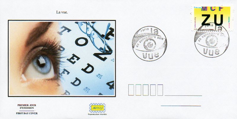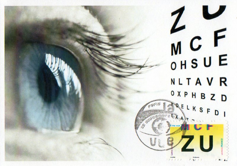 | Commentaire | Provenant du carnet de timbres "la vue" - série de carnet "les cinq sens" A ma vue : avoir une bonne ou une mauvaise vue – il faut détecter les petits défauts (amétropie) de cet organe par des examens de la vue : problèmes de mise au point "myopie"ou "hypermétropie" - de courbure "astigmatisme", des conséquences du vieillissement "presbytie" et de maladies. Action de sensibilisation du public sur les problèmes visuels : Association nationale pour l'amélioration de la vue |