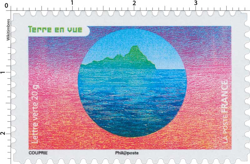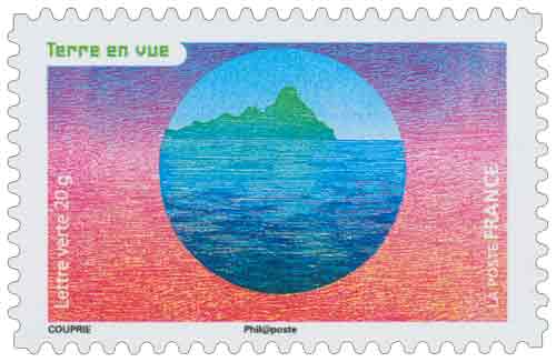 | Commentaire | Provenant du carnet de timbres "la vue" - série de carnet "les cinq sens" Terre en vue : l'expression maritime ancienne : "Terre ! Terre en vue" – après de longues semaines en mer, le soulagement des marins au vue d'une côte, pour y trouver de l'eau douce, d'éventuelles réserves alimentaires, et des contacts humains possibles… |