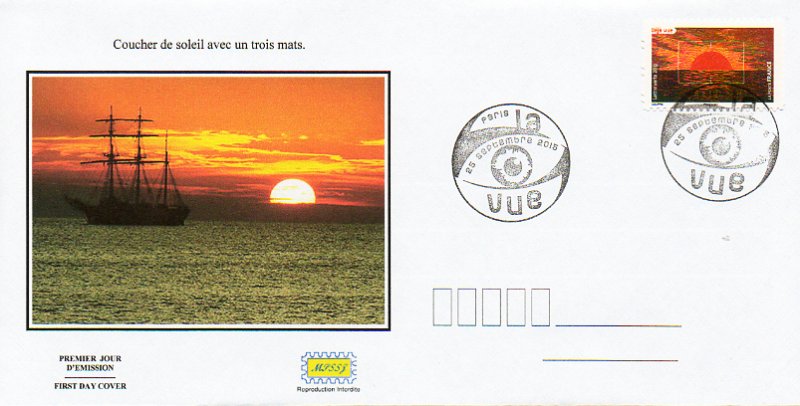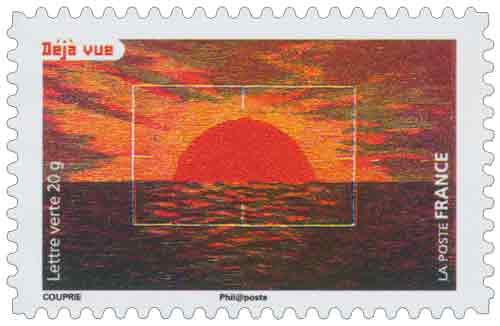 | Commentaire | Provenant du carnet de timbres "la vue" - série de carnet "les cinq sens" Déjà vue : c'est la sensation d'avoir déjà été témoin ou d'avoir déjà vécu une situation présente – le coucher du soleil sur la mer, qui se répète tous les jours (par temps clair, bien sur) |